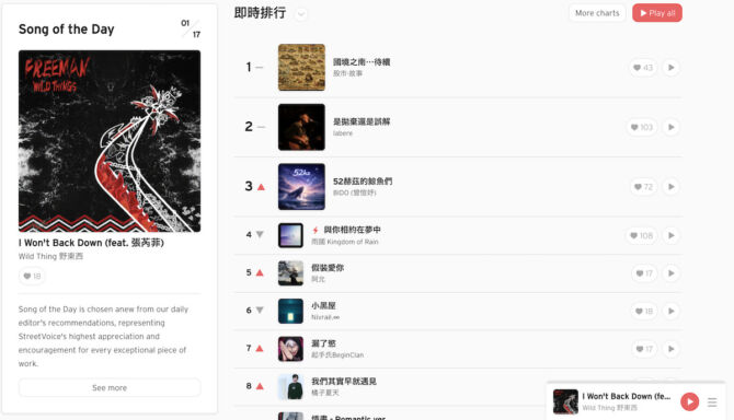 張培仁:現在のランキングは地域ごとの日・時間単位の変化を反映しているため、必ずしも他の地域のリスナーに適しているとは限りません。それは、StreetVoiceが即時的なトラフィックのみを、唯一のレコメンド基準としていないからでもあります。そのため、キュレーションプレイリストからチェックすることをおすすめします。