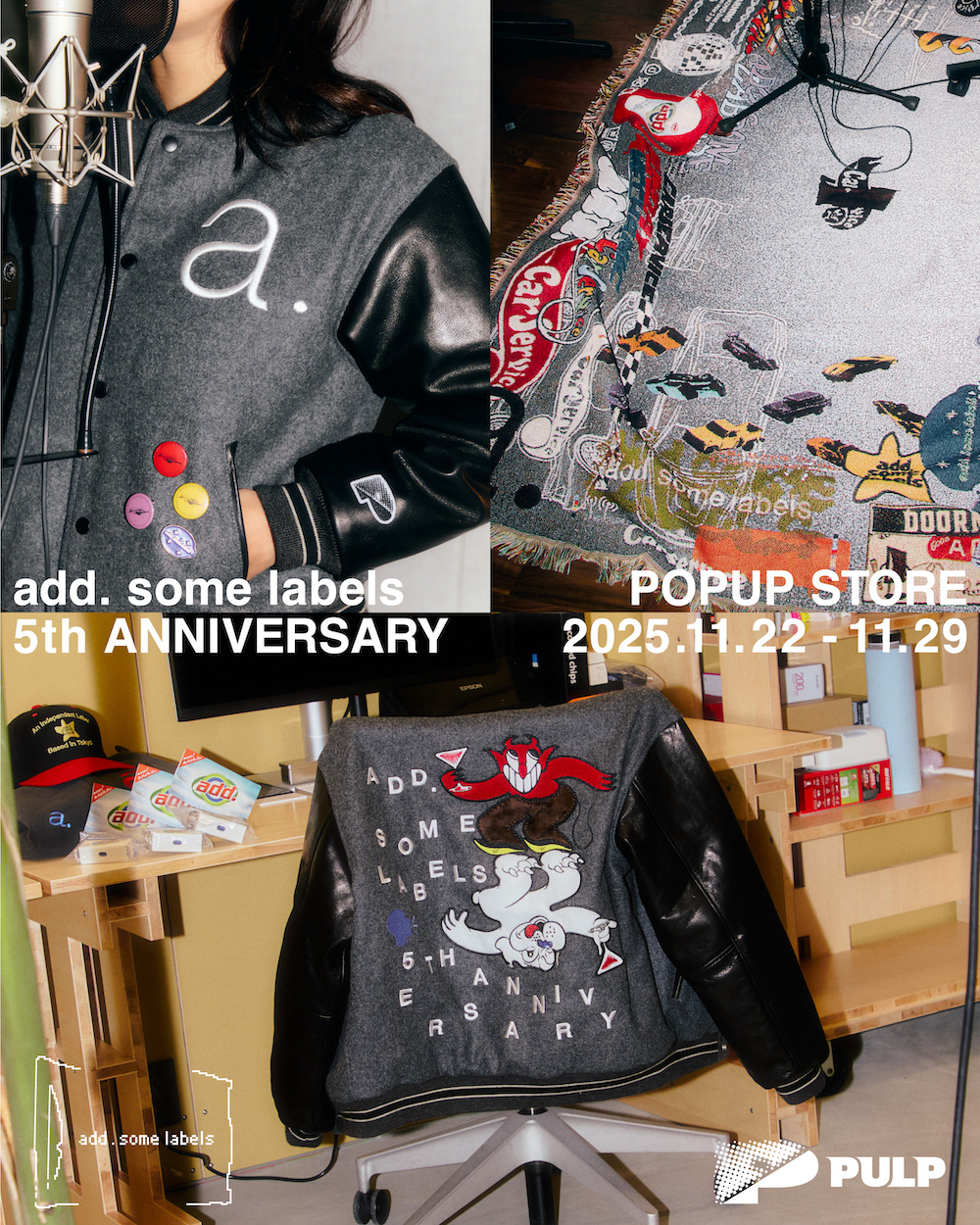 〈add. some labels〉の設立5周年を記念したポップアップが東京・渋谷のセレクトショップ・PULPで11月22日(土)から開催される。