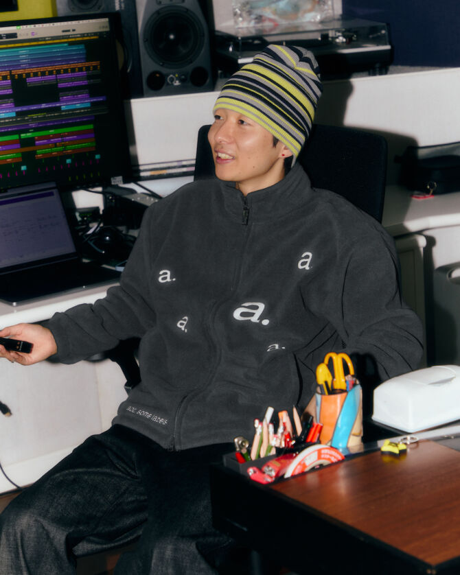合わせて公開されたルックでは、レーベルの軸となっている音楽とデザインの領域で活躍するクリエイターたちが、日々の業務の中でアイテムを着こなす様子が収められている。