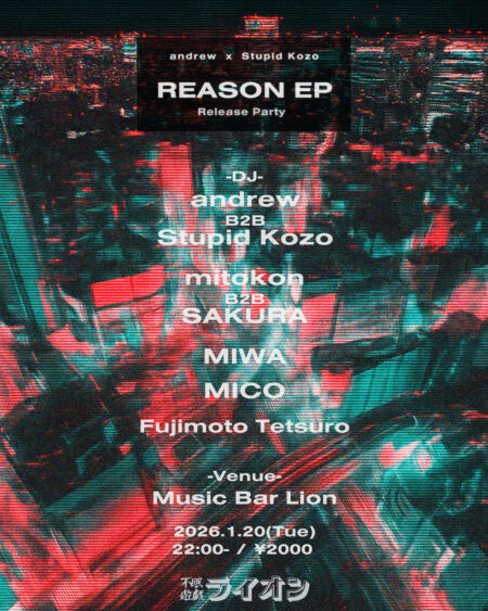 また、1月20日(火)には東京・渋谷 不眠遊戯ライオン(Music Bar Lion)にて本作のリリースパーティが開催される。当日はandrew & Stupid KozoによるB2Bセットを軸に、mitokon(TYO GQOM)とSAKURA(Amapi Night)によるAmapianoを基調としたB2B、さらに2人が活動初期から敬愛するFujimoto Tetsuro、そしてMIWA、MICOといった、EPの世界観とパーティーの文脈を深く共有するDJ陣が出演予定だ。