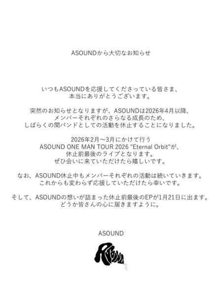 また、ASOUNDは2026年4月以降、バンド活動をしばらくの間休止することも発表。バンドのコメントによると、休止の理由については「メンバーそれぞれのさらなる成長のため」であり、「ASOUND休止中もメンバーそれぞれの活動は続いていきます」とのこと。『ASOUND ONE MAN TOUR 2026 “Eternal Orbit”』が活動休止前の最後のライブとなる。