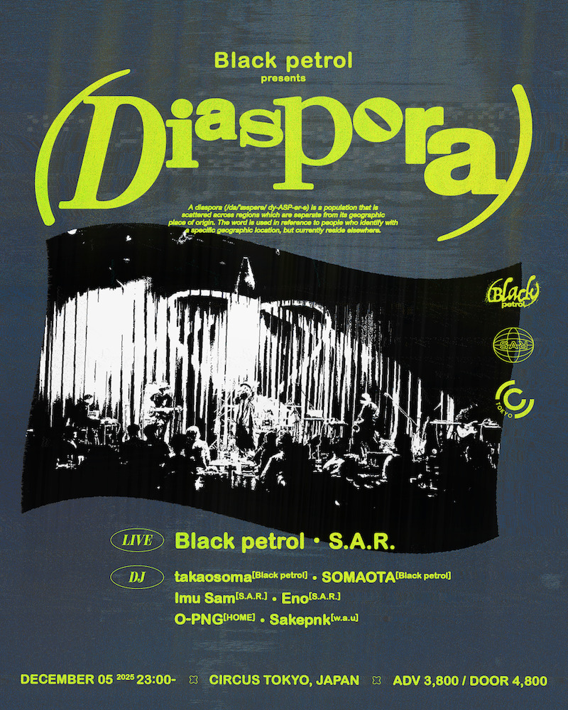 また、Black petrolは12月5日(金)に東京・渋谷CIRCUS Tokyoにて自主企画ナイトイベント『Diaspora』を開催する。ゲストにはSakepnkをはじめ、親交の深いS.A.R.やO-PNG(HOME)らが集結。金曜深夜にライブセットおよびDJパフォーマンスがクロスオーバーした一夜限りのイベントとなる。