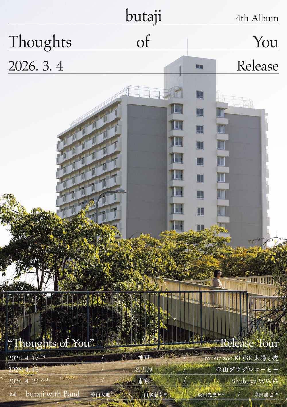 さらに、アルバムのリリースを記念しツアーも開催決定。アルバムの創作の源のひとつともなっている、butajiが幼少期を過ごした神戸から幕を開け、アルバムにも参加している、樺山太地(Gt.)、山本慶幸(Ba.)、坂口光央(Key.)、岸田佳也(Dr.)を迎えた貴重なバンド編成で、神戸、名古屋、東京の全国3都市を巡る。チケットは本日より各地で予約受付がスタート。神戸公演および東京公演ではU23チケットも用意されている