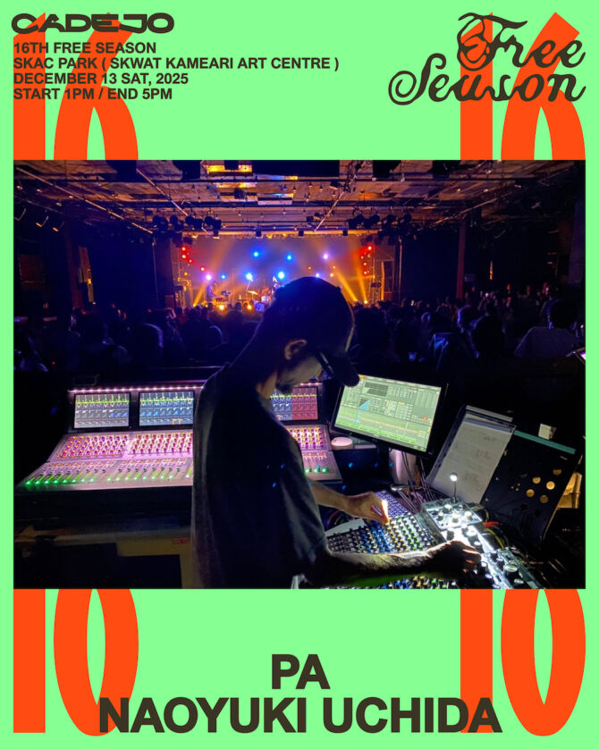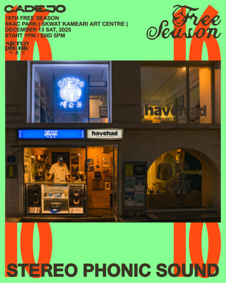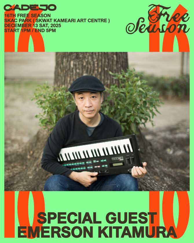 今年6月にダブエンジニアの内田直之を共同プロデューサーに迎えて制作した4thアルバム『ENDLESS』をリリースし、ジャパンツアーを敢行。各地でコアな音楽ファンを魅了しているCADEJO。『FREE SEASON』はCADEJOが韓国で定期的に開催している自主企画で、これまでソウルのカフェ、ブックストア、ハンバーガーショップなど、ライブハウスを離れた空間でロングセットのライブを行ってきた人気シリーズ。日本初上陸となる本公演の舞台は、アートブックショップやレコードショップ、カフェから構成される複合施設・SKAC。高架下という特殊な立地のもとで、アートや音楽、コーヒーなどを通じて様々な文化との出会いや交流が生まれている注目の場所だ。