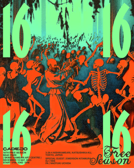 ライブにはゲストミュージシャンとして、CADEJOが敬愛するキーボーディスト・エマーソン北村が出演。エマーソン北村はアルバム『ENDLESS』の収録曲“ENDLESS WAVE”にも参加しており、同楽曲を両者がライブパフォーマンスはするのは初となる。PAはダブエンジニアの内田直之が担当。即興性あふれる演奏で空間をつくりあげる、CADEJOならではのライブに期待が高まる。さらに、SKAC内のレコードショップ「VDS(Vinyl Delivery Service)」がDJを務める。