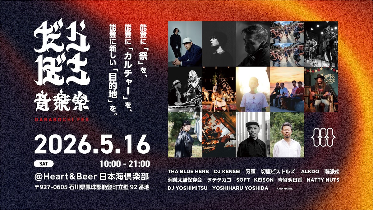 音楽の力で能登半島に新たな「引力」を生み出す音楽祭『だらぼち音楽祭』が5月16日(土)に石川県鳳珠郡能登町・Heart & Beer 日本海倶楽部にて開催される。