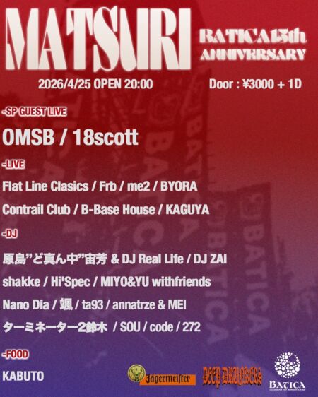 Day4の『MATSURI』には、OMSBや18scottといった豪華な顔ぶれに加え、Flat Line Classicsをはじめ、BATICAの夜を支え続けてきた精鋭ライブアクトが一同に会する。