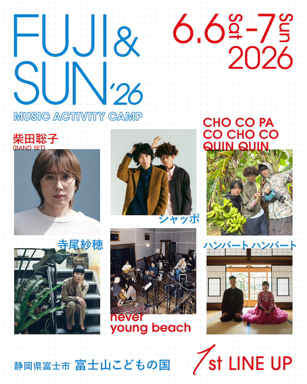6月最初の週末、夏のはじまりを感じる季節に富士山の麓で開催となるキャンプイン音楽フェスティバル『FUJI & SUN ’26』。今回発表されたのは、柴田聡子(BAND SET)、Chappo(シャッポ)、CHO CO PA CO CHO CO QUIN QUIN、寺尾紗穂、never young beach、ハンバート ハンバートの6組。オーバーグラウンドとアンダーグラウンドが絶妙に交錯する、『FUJI & SUN』らしいジャンルレスなラインナップが、爽やかな初夏の野外を彩る。