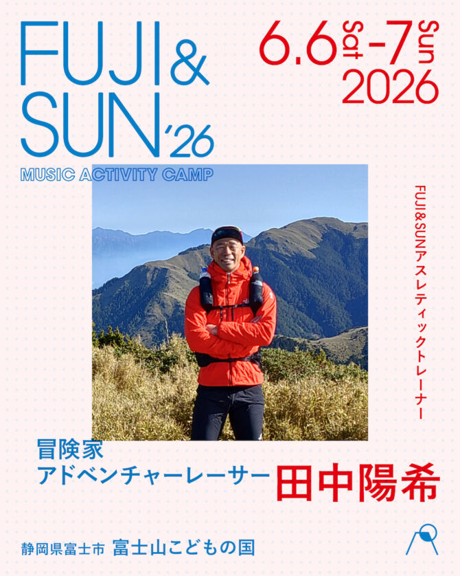 音楽だけでなく、天然の巨大アスレチックともいえる会場「富士山こどもの国」を、冒険するように楽しめる体験型アクティビティも見逃せない。今年も「FUJI & SUN アスレティックトレーナー」として、プロアドベンチャーレーサーであり、日本の三百名山を人力踏破した冒険の達人・田中陽希と、有名モデルや俳優、アスリートから絶大な支持を受けるボディメイクトレーナー・横手貞一朗が参加。両氏が直接、監修・指導を手がけるマインドフルでスペシャルなプログラムは、参加者にとって新たな発見に満ちた、思い出に残るチャレンジとなりそうだ。