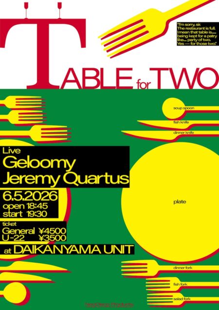 さらに、6月5日(金)には東京・代官山UNITにて、Jeremy Quartus(JQ)を迎えたツーマン自主企画『TABLE for TWO』の開催も決定している。
