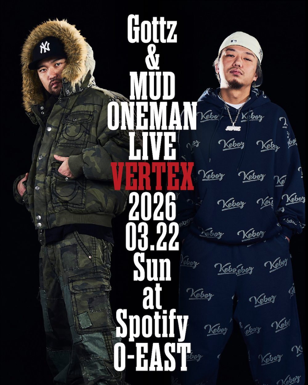 さらに、Gottz & MUDによるワンマンライブ『VERTEX』が東京・渋谷Spotify O-EASTにて3月22日(日)に開催決定。長いキャリアを誇り、数々のビッグヒットを生み出してきた2人による本公演は、これまでの歩みを踏まえたうえで新たなフェーズを感じさせるステージとなりそうだ。