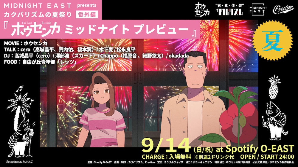 現在〈カクバリズム〉が開催中の『カクバリズムの夏祭り』とコラボした、スペシャルイベントとなる本公演。当日は映画『ホウセンカ』のオールスタンディング試写会をはじめ、cero(髙城晶平、荒内佑、橋本翼)、木下麦監督、音楽ライターの松永良平によるトークセッションを実施。さらに、髙城晶平(cero)、澤部渡(スカート)、Chappo(福原音、細野悠太)、okadadaらがDJとして登場し、深夜の渋谷を音楽で彩る。フードは自由が丘青年部「レッツ」が出店し、夏祭りの屋台をイメージしたフードを提供。