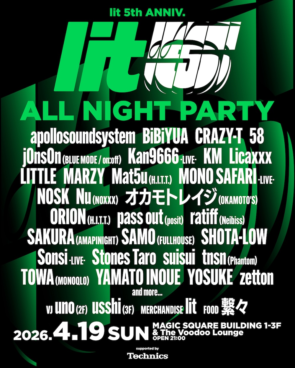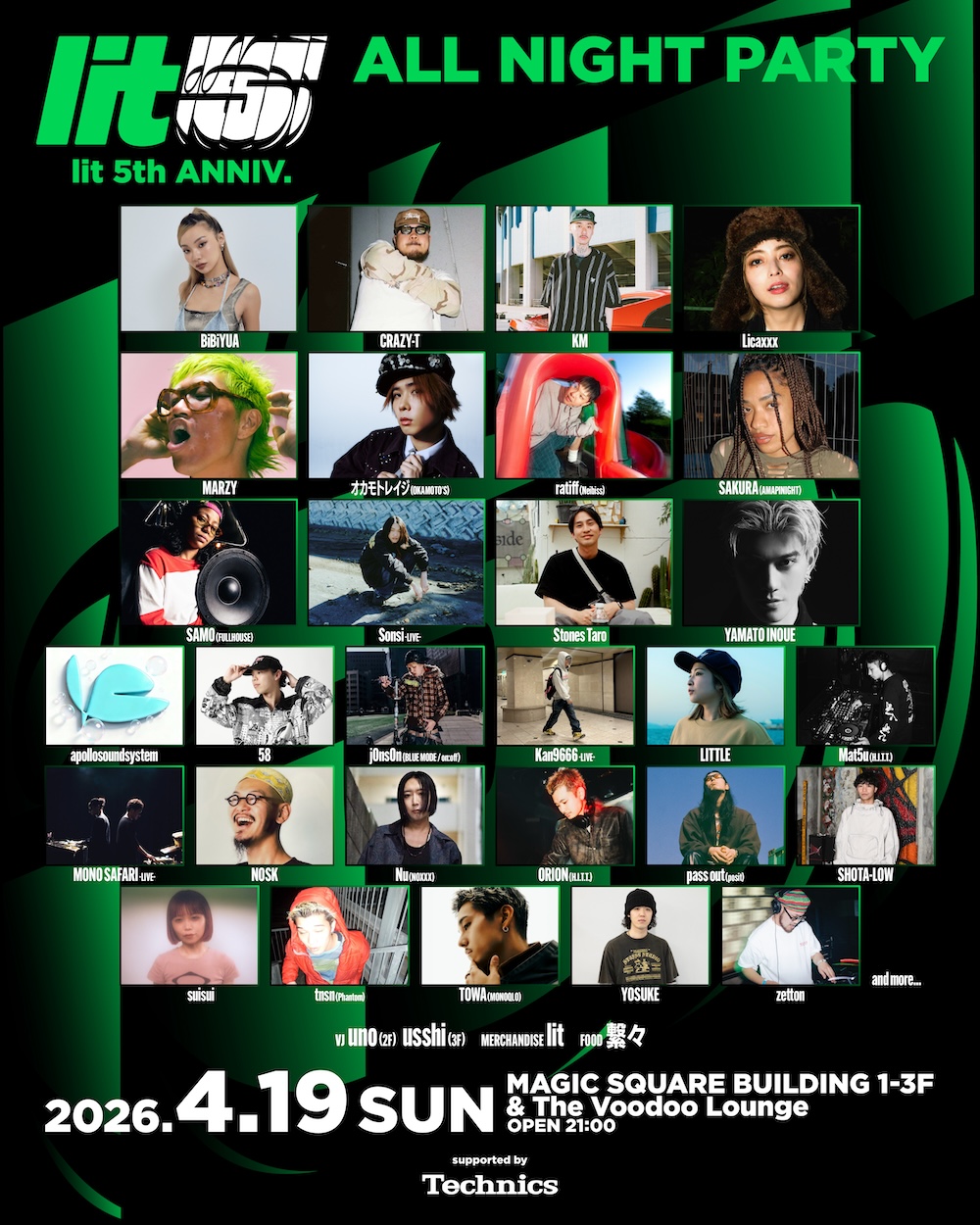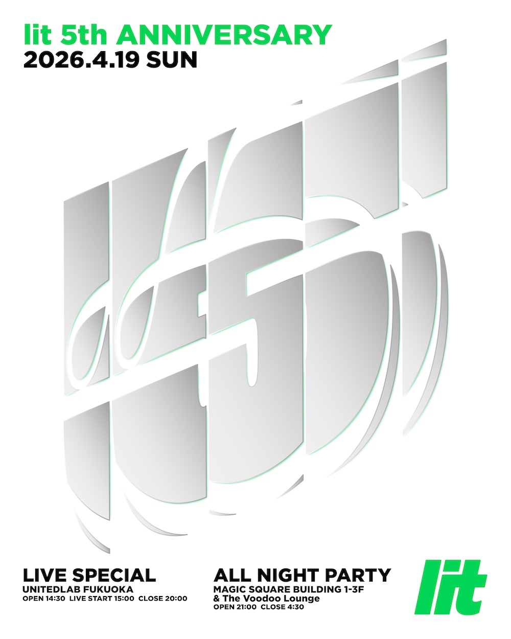 現行ヒップホップを軸に、最先端のダンスミュージックを発信する福岡発のパーティ『lit』の5周年イベントが4月19日(日)に開催される。