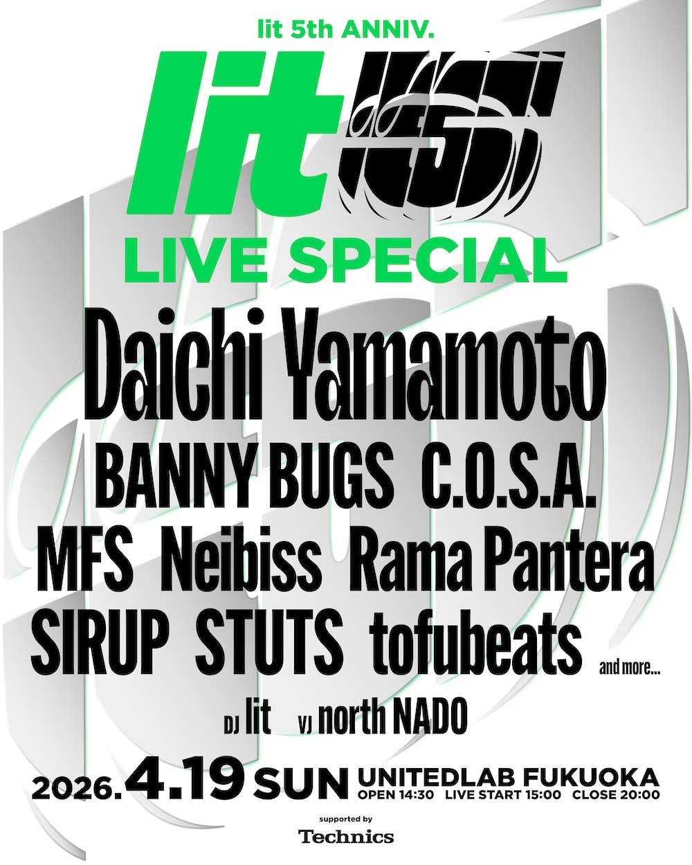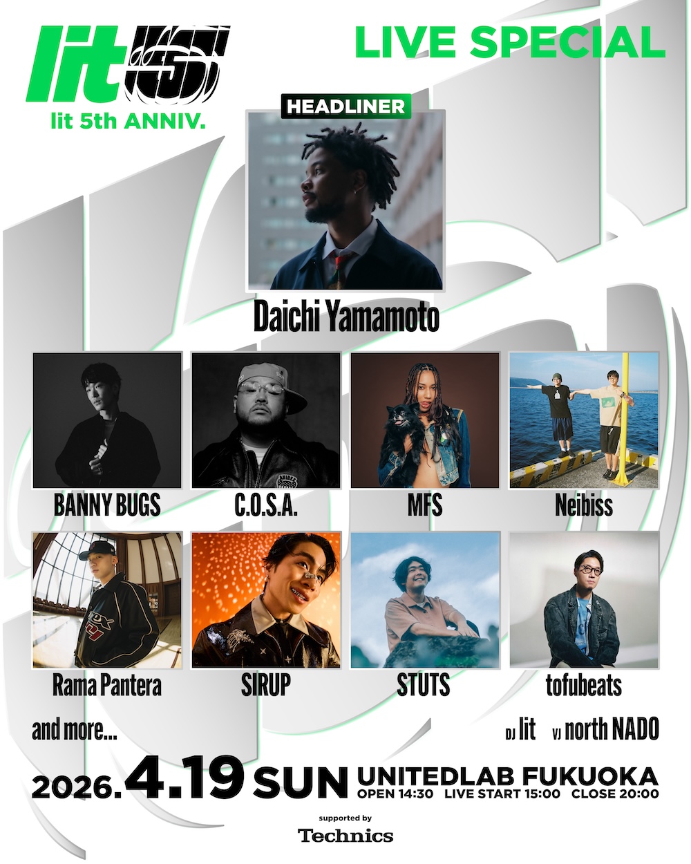 これまでにPUNPEE、KEIJU、IO、STUTS、Tohji、SIRUP、iri、BIM、Yo-Sea、Kohjiya、JJJ、Daichi Yamamoto、tofubeatsなど、全国各地の実力派アーティストが出演を果たし、地元・福岡をはじめとするローカルシーンの才能と交差しながら、独自の熱量を生み出してきた『lit』。昨年4月に開催された4周年パーティでは、延べ2,000人以上を動員。九州発のカルチャーメーカーとして、全国から熱い視線を集めている。