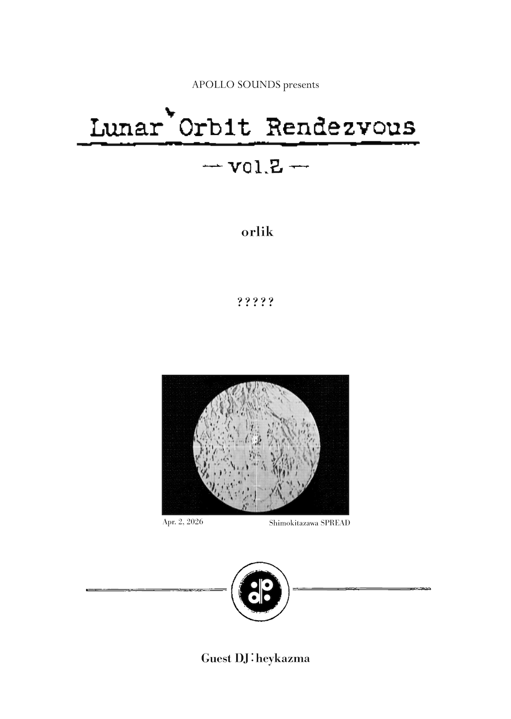 2019年8月に開催され大きな話題を呼んだイベント『Lunar Orbit Rendezvous』が、実に7年ぶりに復活。時を超えて再び掲げられるこのタイトルは、〈APOLLO SOUNDS〉の現在地を示す新たな「邂逅」の場となる。出演には、1stアルバムのリリースを発表したばかりの orlik(オルリック)が登場。本公演は、orlikとして初のライブパフォーマンスとなる記念すべきステージ。ジャンルを横断する独自のサウンドが、ついにライブ空間で解き放たれる。
