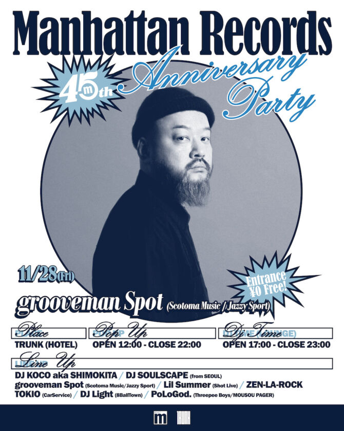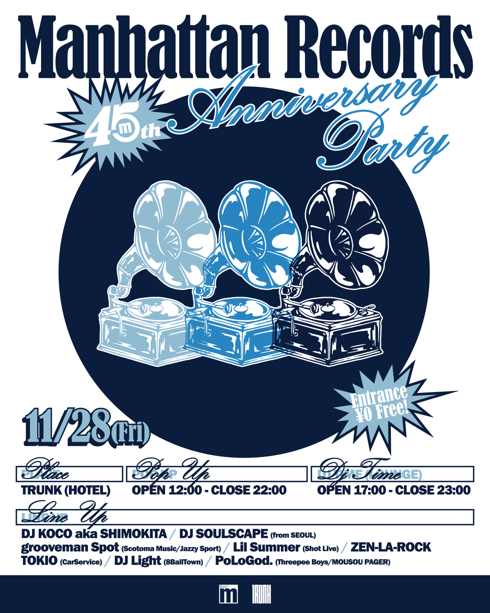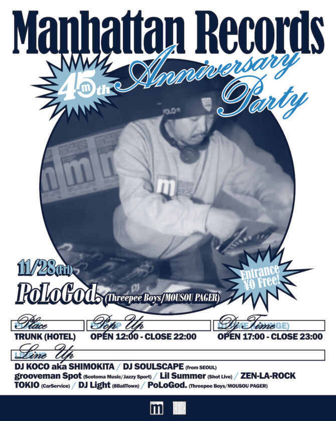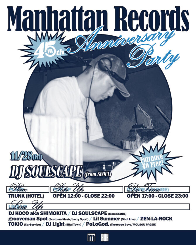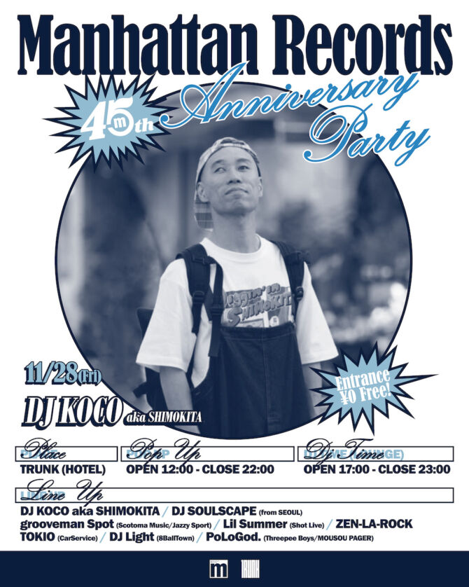 当日はポップアップ、DJイベント、そしてアフターパーティまで、渋谷のカルチャーを象徴する3つの会場で行われるスペシャルな1日となる。メインラウンジである東京・渋谷TRUNK(LOUNGE)内のポップアップスペースには、Manhattan Records® POPUP SHOPがこの日限りで登場。45周年を記念したアパレルやグッズ、さらにDJ KOCO aka SHIMOKITAとの限定コラボアイテムやatmos(アトモス)とのコラボブーツを販売。ポップアップスペースで商品を購入すると、先着でドリンクチケットがプレゼントされる。