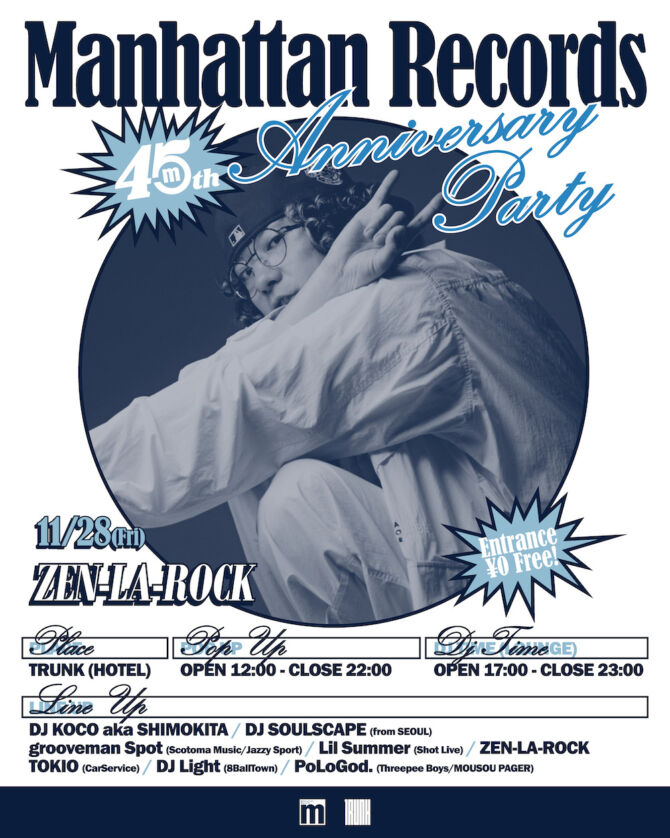そのほか、ZEN-LA-ROCK、TOKIO (CarService)、DJ Light (8BallTown)、PoLoGod. (Threepee Boys / MOUSOU PAGER)といった、Manhattan Recordsとゆかりの深いアーティストが出演する。
