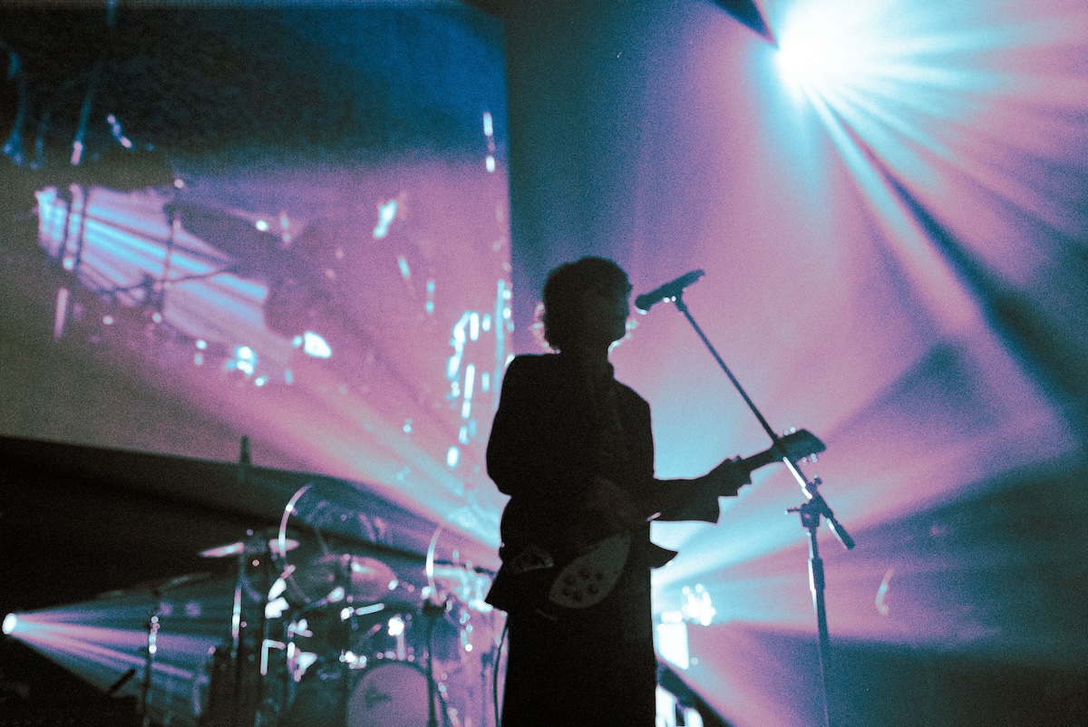 “東京キライ☆”で一層加熱。原曲よりもずっと速く感じるドラムがフロアを揺らし、スクリーンには火のついたマネキンが滑走するMVが映し出される。燃えているビデオ、燃えるような熱気のフロア、Mega Shinnosukeのライブは出し惜しみがない。冒頭から灰になるようなテンションで突き抜けていく。アルバム屈指のキラー“ナードと天使”がとにかく最高。頭のネジがハズれたような音色のキーボードと、全能感をまとってスパークするギター。後者は逆立てた髪とサングラスがいかがわしい雰囲気を醸し出している。Mega Shinnosukeのライブにおいてはお馴染み、ほとんど相棒のようなポジションだろう、Kohei Shimizuのプレイは画的にもサウンド的にもノイジーだ。