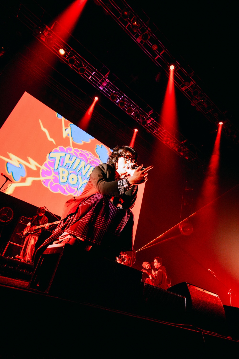 開放感に包まれた会場に、容赦なくガソリンを投下するのがMega Shinnosukeだ。「東京調子どうだい? 楽しくなってきたな!」とアジテートして歌った“Thinking Boyz!!!”は、オーディエンスが歌う《We are the Thinking Boyz!!!》の声が気持ちいい。件の“メロい夢”ではシャボン玉が飛び出し、ファンシーな景色が浮かび上がる。こうしたギミックも大きな会場ならではだろう。爽やかなポップナンバー“君にノーベル賞”を皮切りに、“桃源郷とタクシー”“愛とU”とMega Shinnosuke屈指のヒット曲が続く。そしてTVアニメ『野原ひろし 昼メシの流儀』のオープニング主題歌に抜擢された“ごはん食べヨ”である。狙っているのか狙っていないのかわからないけど、不意にバズを起こしちゃうのがこのソングライターの特性であり、ダンサブルなポップソングは彼の魅力なんだと実感する。