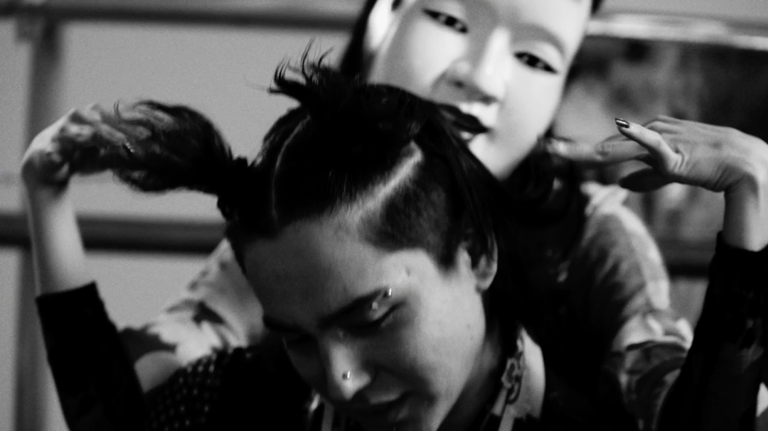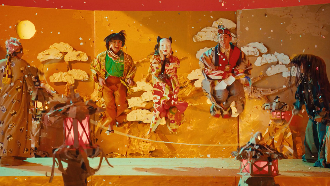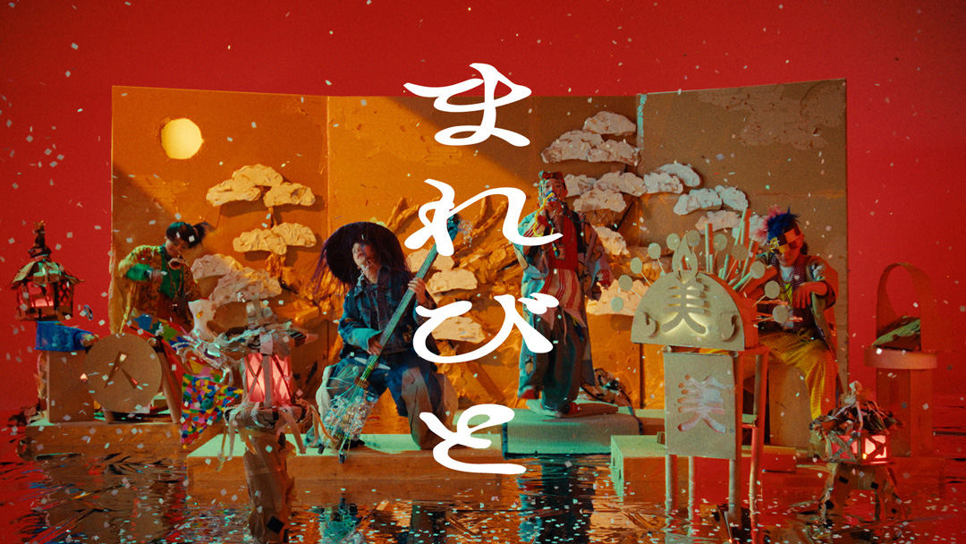 “まれびと”はロックやファンクに口上や祭り囃子を掛け合わせた彼らの最重要曲だが、その強烈な音世界を映像監督・CMプラナーの中田みのりが映像化。ダンボールで作られたDIY空間での演奏シーンに、時代を交差させた衣装とヘアメイク、張り子アーティストの「にしこはりこ」とのコラボレーションによる