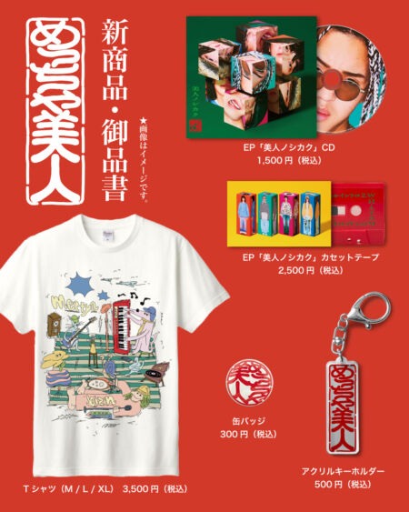 また、めっちゃ美人にとって初となるフィジカル作品として、先述のEP『美人ノシカク』のCD、そしてカセットテープの発売も決定した。こちらは2月18日(水)より全国タワーレコード限定での販売となるほか、2月11日(水)に東京・笹塚ボウルにて開催される自主企画『美人とパーティー』では一足早く入手可能となる。さら、会場ではオリジナルマーチャンダイズも販売予定となっている。