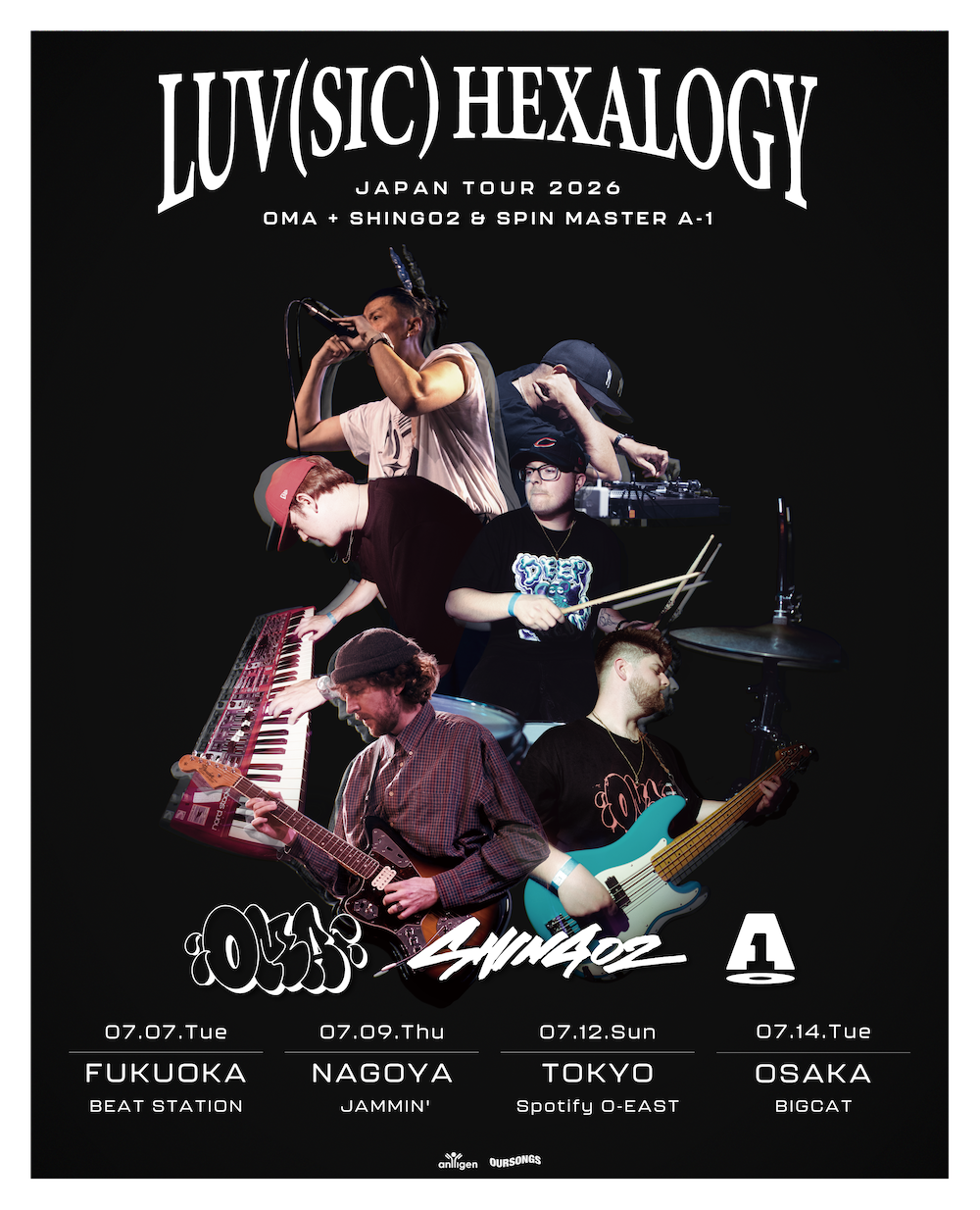 UK、LAを拠点に活動するバンドOMA、東京出身のヒップホップMC/音楽家・Shing02、そしてShing02との共作やライブDJを務めていることでも知られるSPIN MASTER A-1によるツアー『LUV(SIC) HEXALOGY JAPAN TOUR 2026』の開催が決定した。