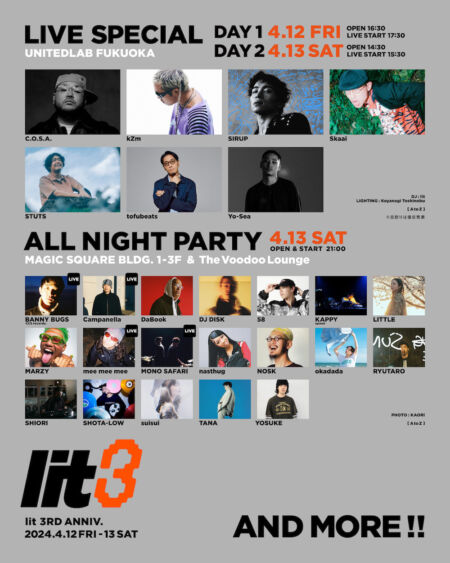 福岡の人気パーティ『lit』3周年企画にSIRUP、STUTS、tofubeats、Yo-Sea、kZmら出演