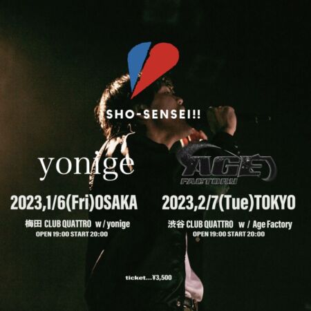 SHO-SENSEI!!、東阪で開催の対バン・ツアーにyonige、Age Factory出演決定