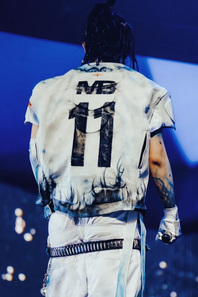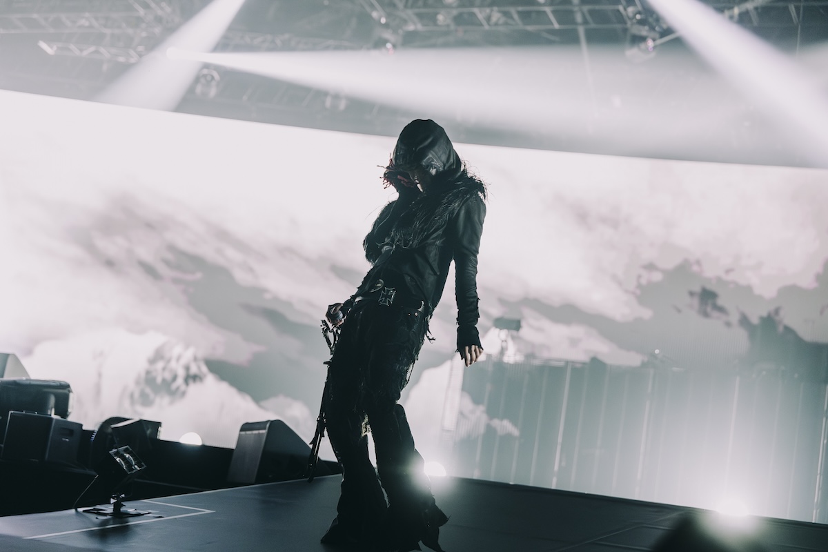 2日目のヘッドライナー・千葉雄喜は、スクリーン全面に映し出された広大な宇宙をバックに“心臓”を静かに歌い始めた。「良かったらiPhoneのライトの光を見せてください」とビートレスの“もらいもの”へ。“流れる”にキーボード、“轍”にはギターも参加した。“生きるだけだな”ではヴォーカルに強烈なエフェクトをかけて、ステージをゆっくりと練り歩いた。アンビエントを彷彿とさせる、アヴァンギャルドな表現に圧倒されていると、SEが流れ出して、オーケストラバンドのメンバーが次々とステージイン。なんと総勢27名。けたたましいサイレンとともにオーケストラがすごい音圧でメロディを奏でて、千葉は「ぶち上がる準備はできてますか?」と叫んだ。「できてる人、両手を見せてください」という言葉を合図にフルオーケストラの贅沢な質感とトラップビートの低音が完全融合した“心配無用”を演奏した。圧巻の音像に観客は騒然となる。前半の千葉は“今しかいらない”と歌ったが、後半は素直に物欲を吐き出した。このように矛盾をありのまま表現したことに大きな意味がある。“重てえ”の前には御徒町のジュエリーショップ・GRILLZ JEWELZのアキ氏を呼び込んで特大チェーンを装着。ラストは全員参加の“チーム友達”で大団円を迎えた。