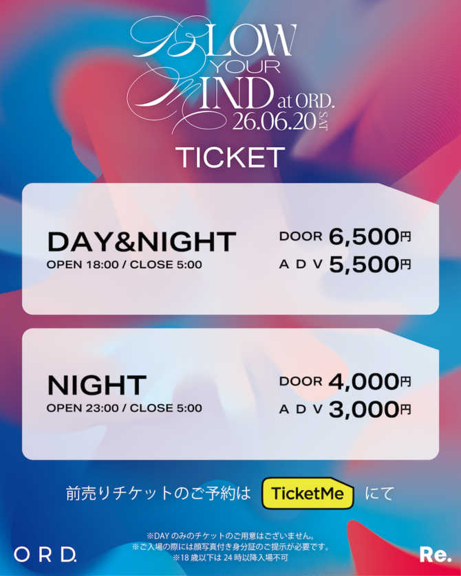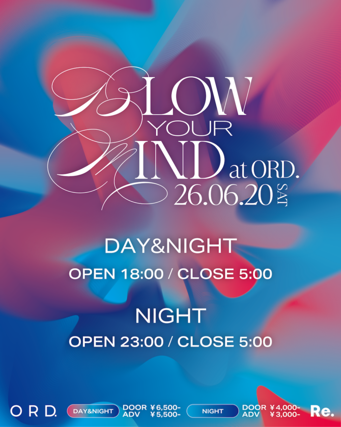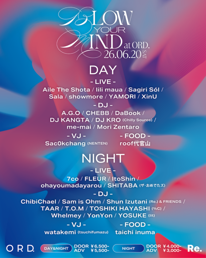 マルチプロデュースコレクティブ〈Re.〉(読み:アールイー)主催イベント『BLOW YOUR MIND』が6月20日(土)に東京・代官山ORD.にて開催される。