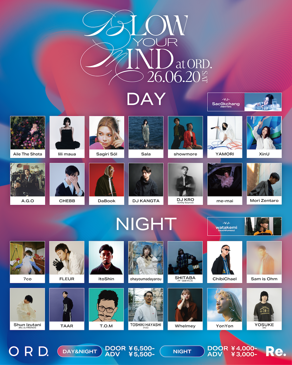 前回は〈Re.〉の集大成としてDAY & NIGHTの2部構成で開催し、300名を超える動員を記録した『BLOW YOUR MIND』。今回はORD.の「1st Anniversary月間」の一環として同店の全面協力が実現。再びDAY & NIGHTの2部構成で、過去最多となる28組のアーティストが出演する。