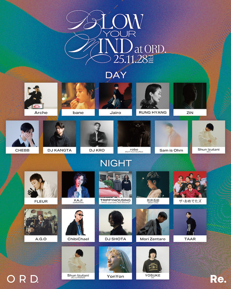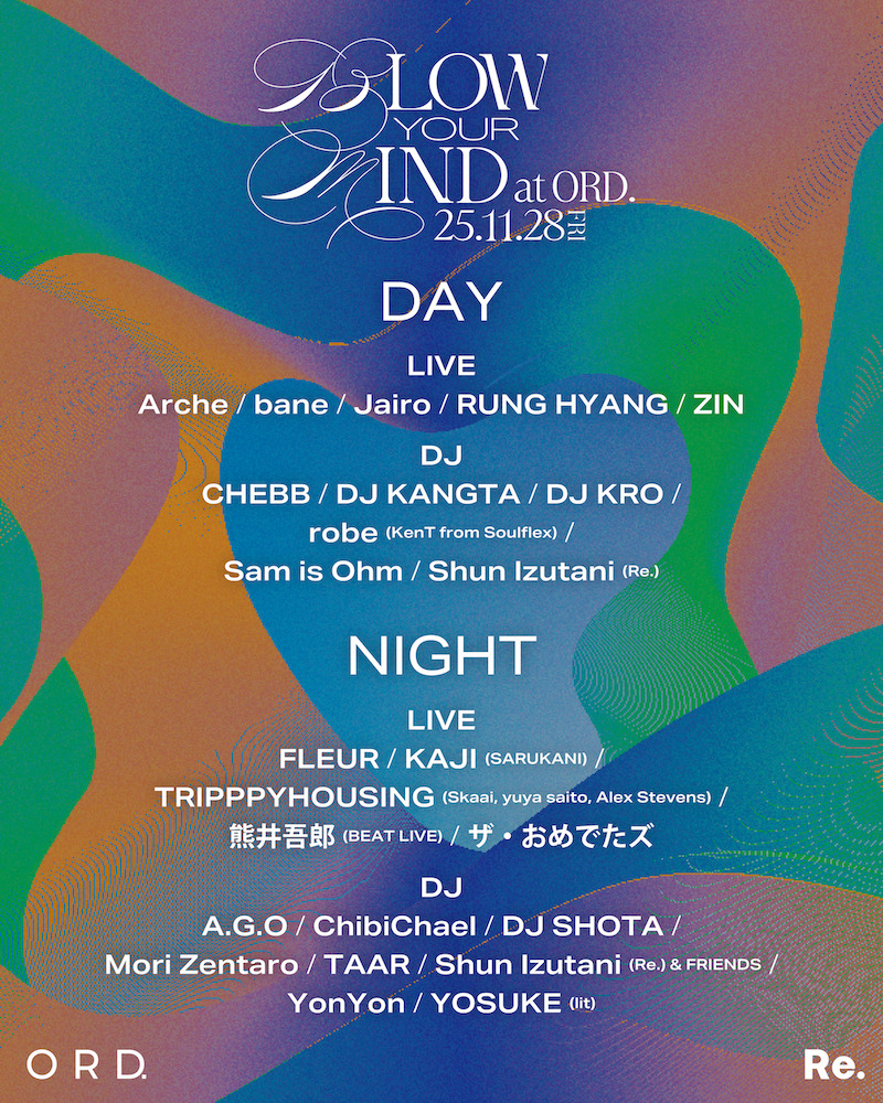 マルチプロデュースコレクティブ〈Re.〉(読み:アールイー)主催イベント『BLOW YOUR MIND』が11月28日(金)に東京・代官山ORD.にて開催される。