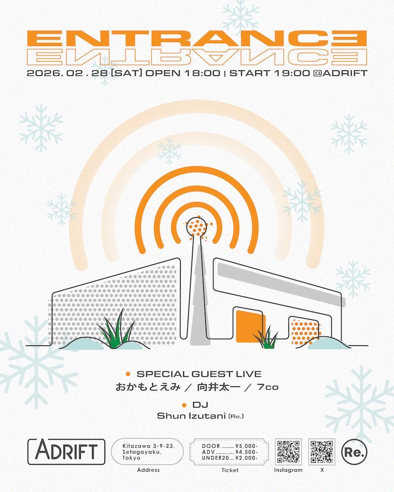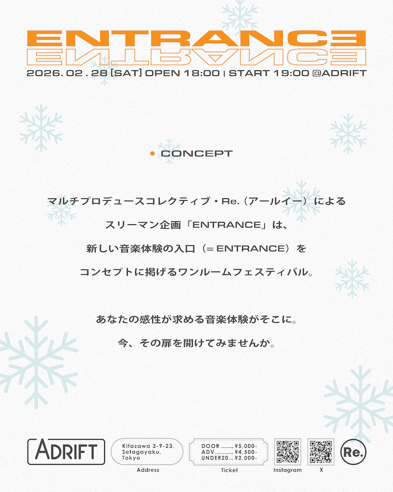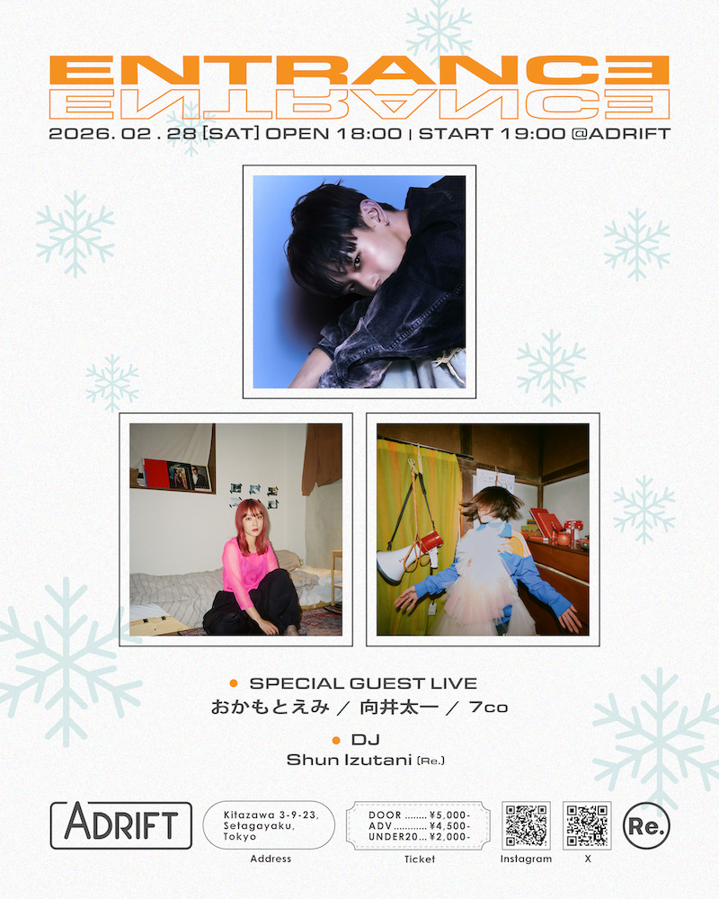 マルチプロデュースコレクティブ〈Re.〉(アールイー)によるスリーマン企画『ENTRANCE』が2月28日(土)に東京・下北沢ADRIFTにて開催される。