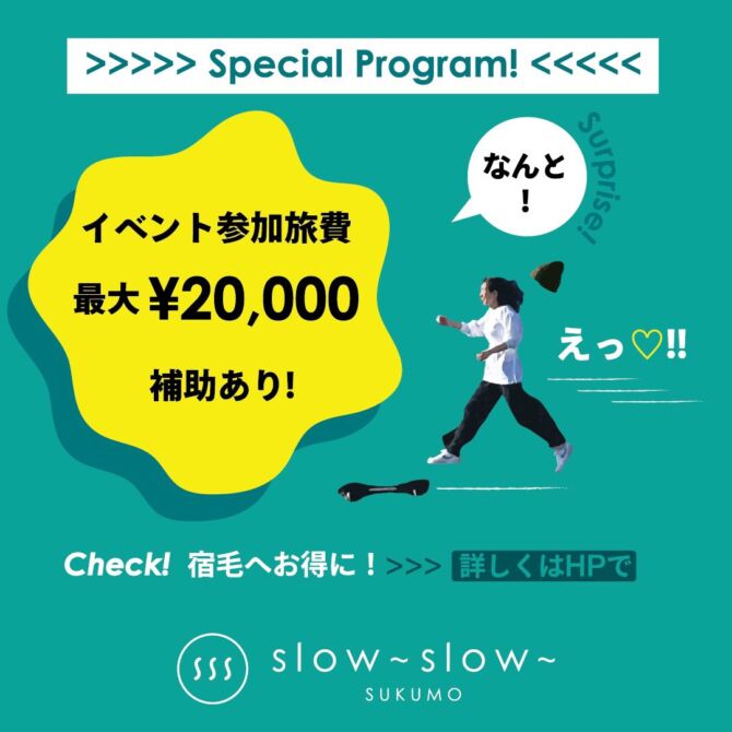 宿毛市が主催し、宿毛まちのえき林邸(合同会社ドラマチック)が企画・運営を担う『slow slow SUKUMO』は、宿毛市の人口減少対策の一環として行われる、地元市民と地域外の方向けの交流イベント。「良い場・良い出会いをつくる」をコンセプトに、新たな交流、出会い、友人作り、大切なパートナー探し、関係人口や交流人口を増やすことを目的に掲げ、地域外参加者に対しては交通費・宿泊費(最大20,000円)の補助も用意されている。
