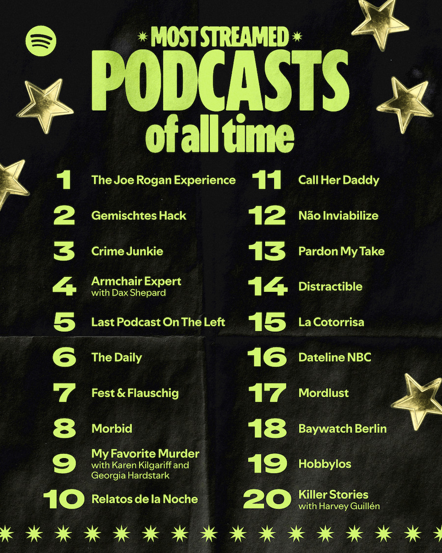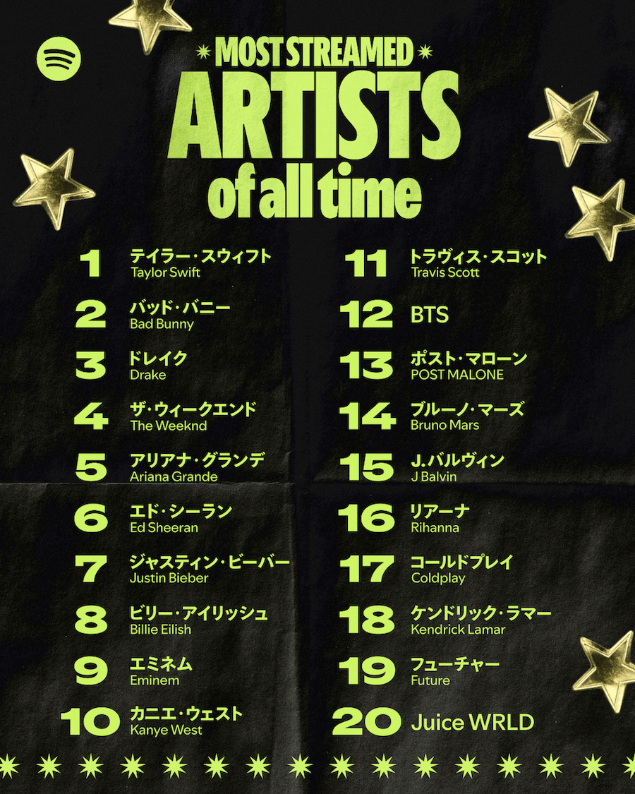 創業以来初となる今回のランキングは、アーティスト、楽曲、アルバム、ポッドキャストの4カテゴリーを発表。長年にわたり蓄積されたリスニングデータをもとに、単なるヒットにとどまらず、人々の日常生活に深く根ざし、世界中で愛され続けてきたコンテンツがランクインしている。