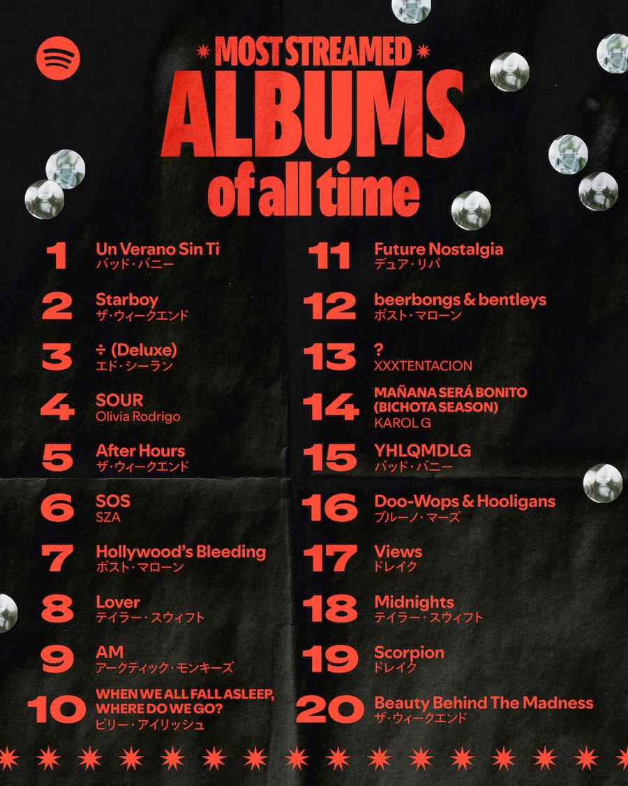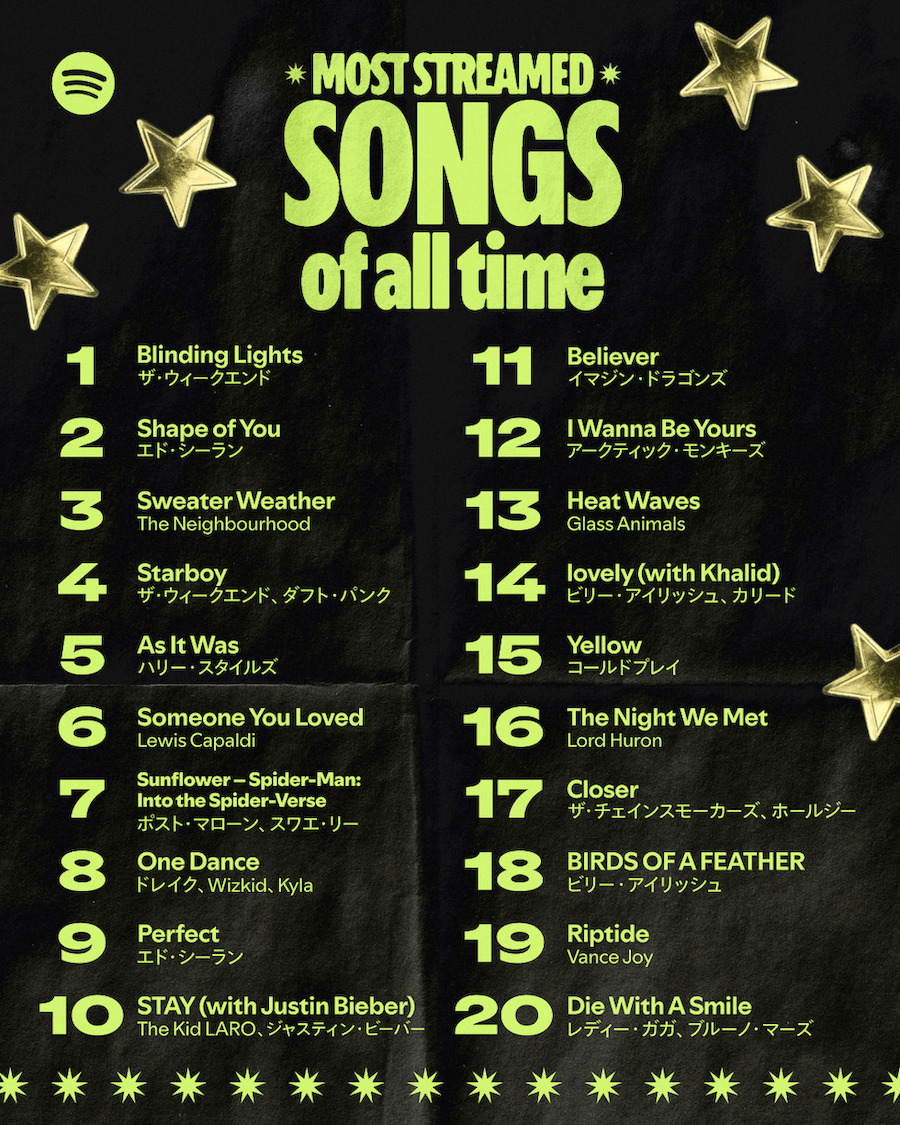 2026年4月23日(木)にサービス開始20周年を迎えたSpotifyが、歴代で最も再生された各種ランキング(グローバル)を公開した。