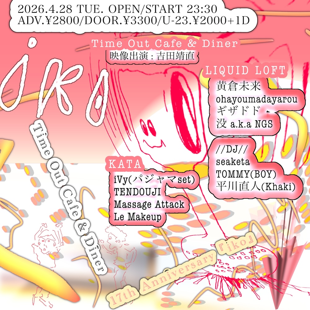 東京・恵比寿Time Out Cafe & Dinerの17周年を祝し、渋谷のショップ & スペース・BOYのオーナー・奥冨直人と、音楽家/映像作家のseaketaがキュレーションを務めるアニバーサリーイベント『iko』が4月28日(火・祝前日)に開催される。