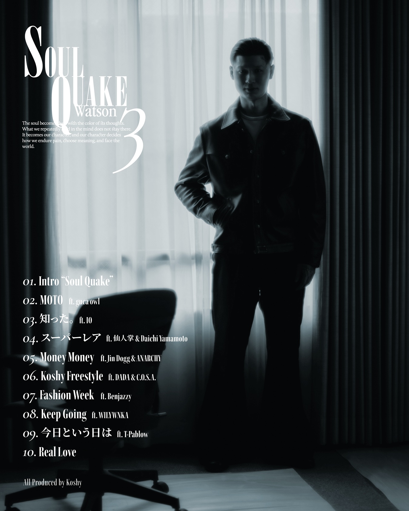 2月25日(水)にリリース予定の本作は、『Soul Quake』シリーズの最終章にふさわしく、初期Watsonを彷彿とさせるような硬派で無骨なスタイルを、多彩な客演陣で彩った一作だという。タッグを組むプロデューサー/ビートメーカー・Koshyのビートに、既発曲であるBenjazzyとの“Fashion Week”に加え、全10曲を収録。客演にはIO、Jin Dogg、ANARCHY、DADA、C.O.S.A.といったお馴染みの顔ぶれから、guca owl、仙人掌、Daichi Yamamoto、WILYWNKA、T-Pablowという初手合わせとなるアーティストが名を連ねている。