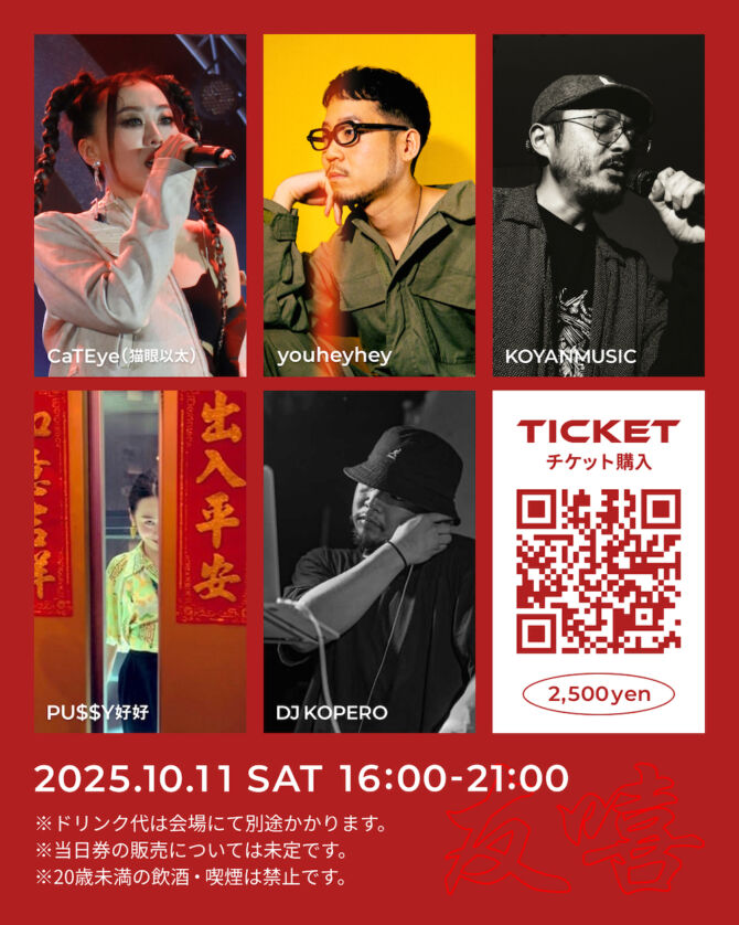 本イベントには東京と上海を拠点に、中国語・日本語・英語を自在に操るラッパー/プロデューサー/DJの CaTEye(猫眼以太)、ヒップホップコレクティブ〈Oll Korrect〉のメンバーとしても知られるラッパー/ビートメイカー/DJのyouheyheyがライブアクトとして出演するほか、神奈川相模原出身・〈SD JUNKSTA〉のメンバーであり、長年ラッパー/プロデューサーとして数多くの作品を手がけてきたKOYANMUSICもビートライブを行う。