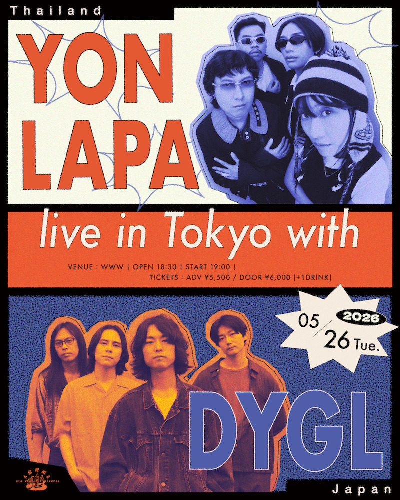 タイ・チェンマイ発の4人組バンド・YONLAPAと日本の4人組バンド・DYGLによるツーマンライブが5月26日(火)に東京・渋谷WWWにて開催される。