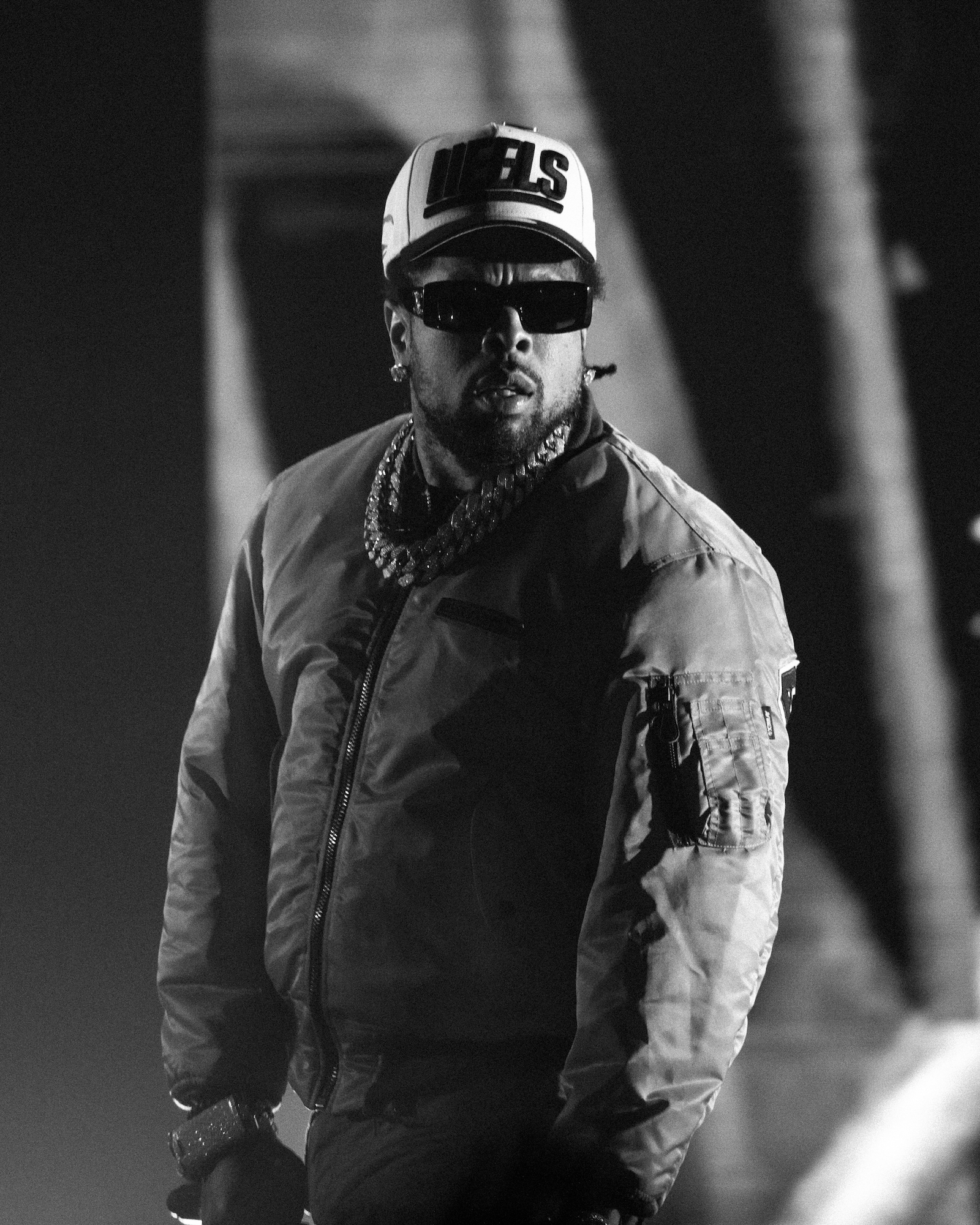 そして、午前3時。空気が一変した。銃声のようなアドリブ「Boom Boom Boom……」を響かせながら、暗がりの中から「スーパーフライゴジラ」ことWestside Gunnが姿を現す。頭には自身が主宰するプロレス × ヒップホップのプロジェクト・4th Ropeのキャップ、トップスにはAVIREXのジャケット、足元はGriseldaモデルと思われる真っ赤なSauconyを身に付けていた。